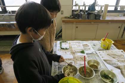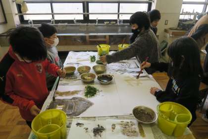 図工の時間には、学校で見つけたいろいろな種類の土を使って、絵に表す活動をしました。色や粒の大きさなどの素材の違いを生かしながら、工夫して作品に表そうとする姿が見られました。