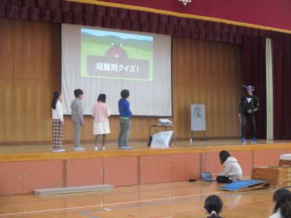 2月のにこにこ集会がありました。その中でえのき学級の発表があったのですが、私も王子役で出演しました。魔王が王子を恐竜に変えてしまい、子どもたちが魔王の出すお題をクリアしていくといった内容です。8段のとび箱を跳んだり、地図パズルの鬼難バージョンをしたり、魔王の「ま」を漢字で書いたり、袋を宙に浮かしたりして、魔王を倒しました。子どもたちの得意なことを披露し、大きな拍手をもらいました。とっても素敵な発表でした。私も一緒に楽しませてもらいました。