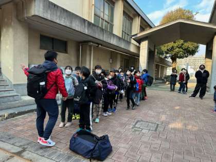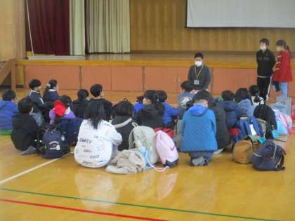 体育館で出発式を行い、バスに乗りお見送りに来ていただいた方に手を振り、出発しました。