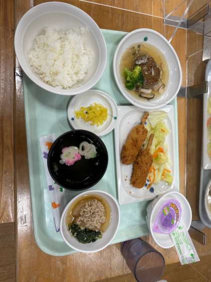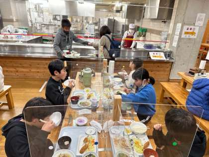 夕食です。美味しいという声がたくさん聞こえてきます。食欲旺盛の子どもたち。しっかり食べています。串カツが人気でした。