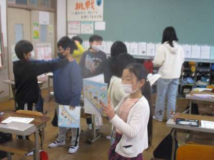 今日は,ALTの先生と一緒にUnit8での学習のまとめを行いました。これまでに習った表現を確認したり,自分のお気に入りの場所を友だちと伝えあったり,全体に向けてクイズとして出題したりしました。取り組んでいく中で,回れ右は英語でどのように表現すればよいのかという疑問が生まれ,ALTの先生に教えてもらうことができました。Turn around と表現すればよいということを知った子どもたちは,さっそく表現に組み込んでいました。