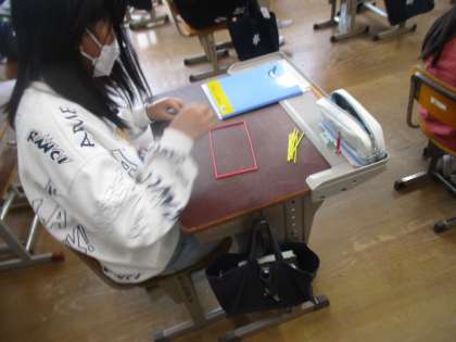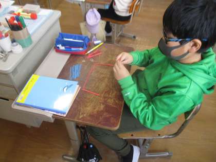今日から算数の授業は新しい単元に入りました。1時間目の今日は,懐かしい数え棒を使って,長方形を作りました。その出来上がった長方形からたてと横の長さの関係を見つけていくという課題でした。表にまとめることで変わり方がとらえやすくなることを実感している様子の子どもたちでした。