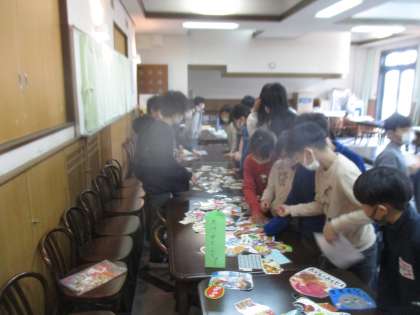 今日の中間休みは,読書バザールに参加しました。4月から読み貯めてきた本の冊数をポイントに変えて,ミニブックやしおり,すごろく,ぬりえなど素敵な商品に交換していました。教室に戻るとさっそくぬりえをしていたり,しおりを使ったりしていました。これからもたくさん本を読んで,素敵な本に出会ってほしいと思います。