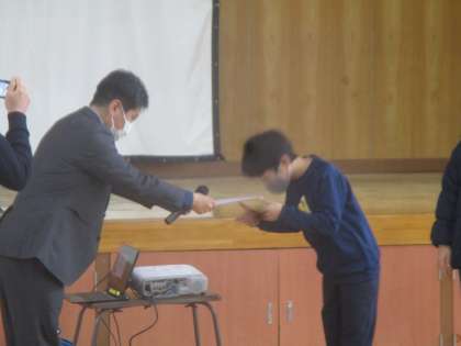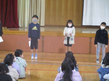 今日は、今年度最後のにこにこ集会でした。先月のにこにこ学習のふり返りや1年生の発表、今月のテーマに関する話、作品の表彰など盛り沢山なにこにこ集会でした。4年生からも1名版画の作品で佳作の表彰をいただき、クラスみんなでお祝いしました!