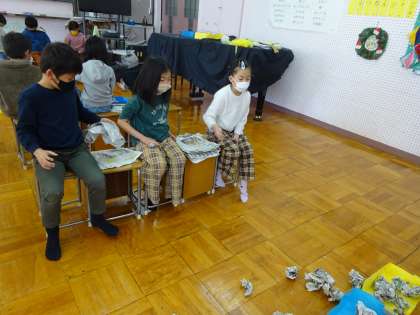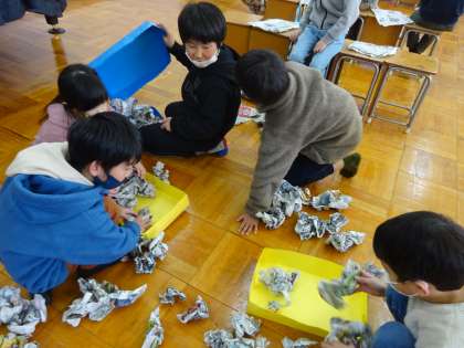 かた手で新聞紙を丸めて、チームのかごに入れます。