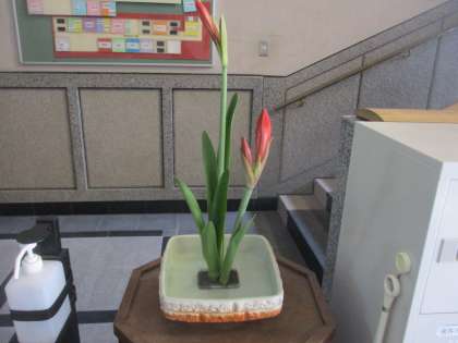 本日,今年度最後の生花教室が行われました。アマリリスを生けました。短い葉が手前にくるように,茎が葉の間から見えるように葉と茎のバランスを考え生けました。