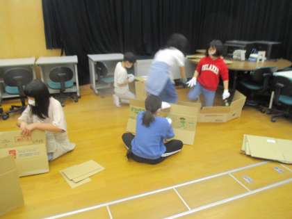ダンボールを使った工作をしました。秘密基地のようなものを作ったり、車を作ったり、それぞれがグループでイメージを共有しながら制作していました。いろいろなアイデアが子どもたちから出てきて、とても楽しい活動になりました。チームあきた号では、ダンボールを繋ぎ合わせる際にテープ類を使わない方法を3種類も発見し、場所によって使い分けながら組み立てていました。