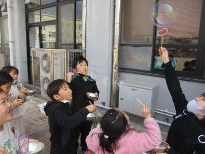生活科の時間では,シャボン玉遊びをしました。自分たちでシャボン玉を吹くための道具を作って,運動場で行いました。みんなとっても大きなシャボン玉が出来て,大喜びでした。なかなか割れないシャボン玉や二階以上に高く飛んでいったシャボン玉など,いろいろなシャボン玉に驚いていました。