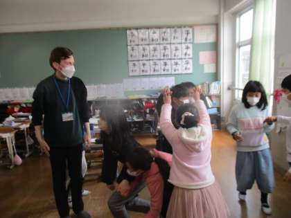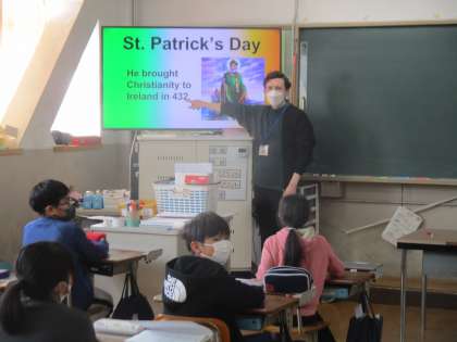 今日は、今年度最後の外国語活動の時間であり、さらにALTの先生とも最後の時間でした。ALTの先生の母国である北アイルランドのセント・パトリック・デーという国民の祝日の文化について学習しました。現地の様子や催物の内容などについて紹介してもらった後、実際にその中の1つのアイリッシュダンスをみんなで楽しみました。