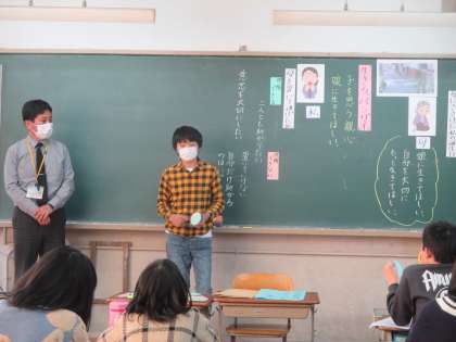 卒業まであと少しです。授業をしていても、この子たちと授業をするのは最後か・・・、と思うと辛くて悲しくなってきました。でも、今日の授業「前を向いて生きる」ことを大切に、お祝いの気持ちとエールを送らないといけませんね。心に残る授業となりました。