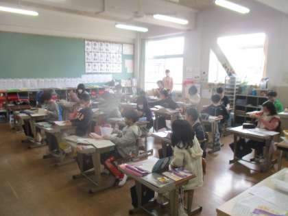 今日もみんなで意見や考えを出し合いながら問題を解き進めていきました。違うルートをたどっても移動する距離と方向は同じということに気づき、いろいろなパターンを導き出していました。ちなみに今日の算数の授業は、何かが違って新鮮な授業でしたが、写真の様子から分かりますか。