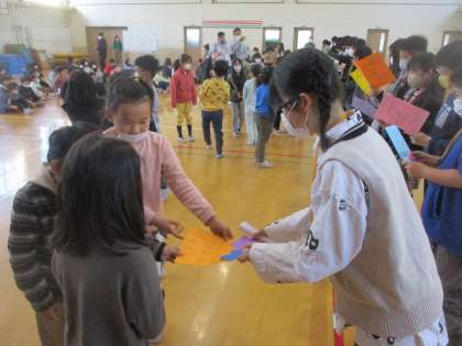 6年生と楽しむ会で,一年間お世話になった6年生やたてわりグループのメンバーでいろいろなゲームを楽しむことができました。最後には,事前に用意したメッセージカードを送り,6年生も喜んでいました。
