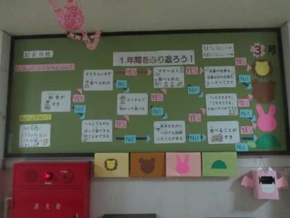給食室前の掲示板では、1年間をふり返れるような掲示板にしています。自分はどのタイプに当てはまるのか、一度は見てくださいね!