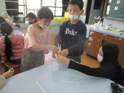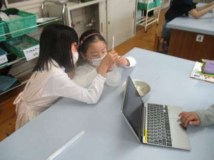 今日はこれまでとは違って、水を冷やして、液体から固体へと状態を変化させる様子を観察する実験を行いました。水の温度の下がっていき方を表とグラフにまとめながら確認することができました。
