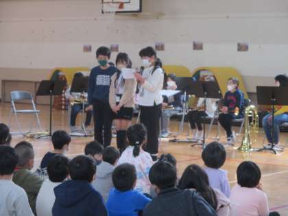 児童会のまとめの会と、金管バンド部のお別れコンサートがありました。まとめの会では、児童会代表としてがんばってくれた6年生が全校にメッセージを残してくれました。金管バンド部は、2曲の演奏の後、卒業する6年生3人が話をしてくれました。