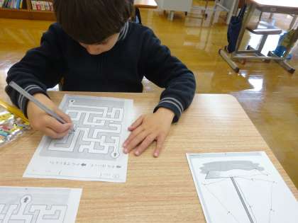 さんすうの じかんに、すうじつなぎと めいろを しました。