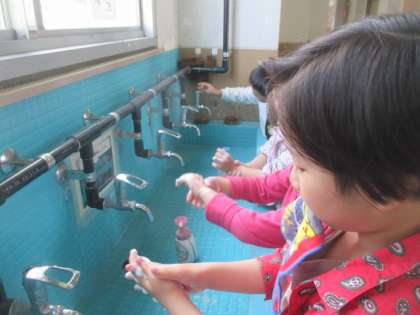 養正小学校では手洗いの歌が休み時間の終わりに流れます。上手な手洗いの仕方を学習し、早速実践しました。歌に合わせてしっかり手洗いができました。