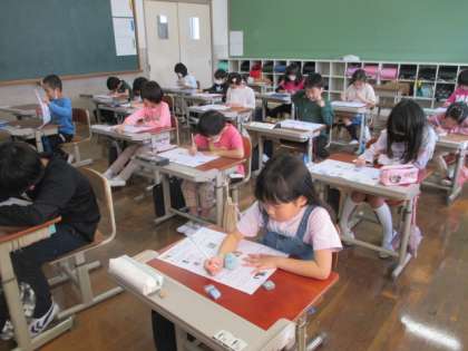 1年生で学習した漢字や言葉の復習をテスト形式で行いました。静かに落ち着いて取り組む姿は、やっぱり2年生!素敵でした。1年生の漢字はバッチリな人がたくさんいました。2年生の漢字も一緒に頑張っていきましょう!!