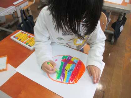 図工の学習で「にこにこおひさま」か「にこにこおつきさま」かを選んで、絵をかきました。給食当番でたいようグループとつきグループがあるので、子どもたちも「描きたい!」と意欲的に取り組むことができました。色を丁寧に塗ることを意識し、とてもすてきな絵に仕上がりました。