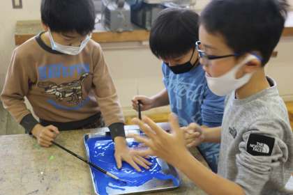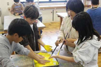 学級目標の言葉をみんなの手のひらでかざりました。手のひらに絵の具を塗ってペッタン!みんなの手が学級目標を支えているというような感じがしてとても素敵です。もっともっと素敵なクラスに成長していきましょう。完成品をお楽しみに。