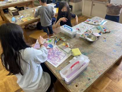 今日は3年生初めての図工の学習で、絵画作品に取り組みました。絵具を混ぜて色をつくったり、水の量を調節したりして色の調節をするだけでなく、筆の使い方も合わせたいろいろな描き方で、作品を仕上げました。
