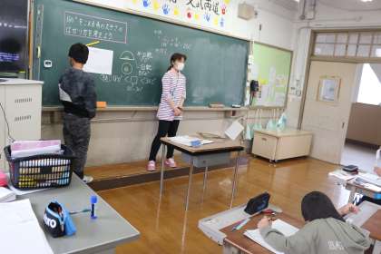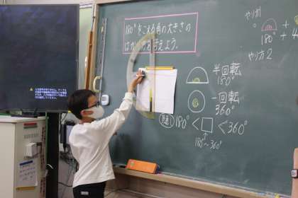 算数科の学習で、180°をこえる角の測り方について考えました。そのままでは測ることができないという困りがありましたが、半回転である180°、一回転である360°を生かすと考えられることを発見しました。きっかけから考え方を見つけた時の子どもたちの嬉しそうな顔が光っていました。