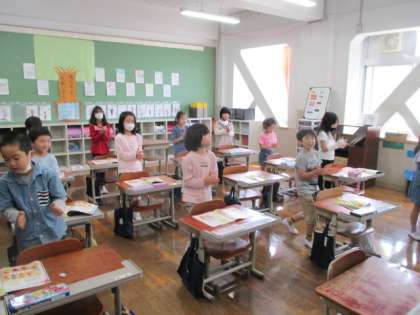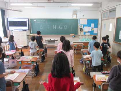 音楽科「音がくでみんなとつながろう」の学習では、「小犬のビンゴ」をみんなで歌いました。歌が進むにつれて「B・I・N・G・O」のアルファベットを歌う部分が少なくなり、その分、手拍子をする部分が増えていきます。初めこそ、手拍子や歌うタイミングが難しそうでしたが、慣れるとみんな息ピッタリの歌唱ができていました。
