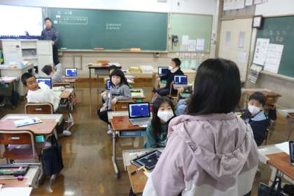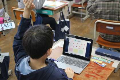 算数科でついにわり算の学習がスタートしました。今回は、ロイロノートを使っていちごを三人に分けるという問題に取り組みました。同じ人数に分けているのに、友だちと分け方が違うことに気づいたり、わり算の仕組みに気づきだしたりする子もいて,とても意欲的に頑張っていました。ロイロノートを使いこなしているのもさすがですね。