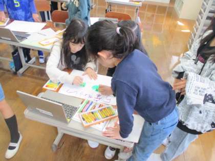 生活科では、学校たんけんに向けて準備をすすめています。1年生を案内するために学校中の部屋という部屋の案内ポスターをつくっています。どうすれば分かりやすく教室のことが分かるか、みんなで試行錯誤しながら作りました。