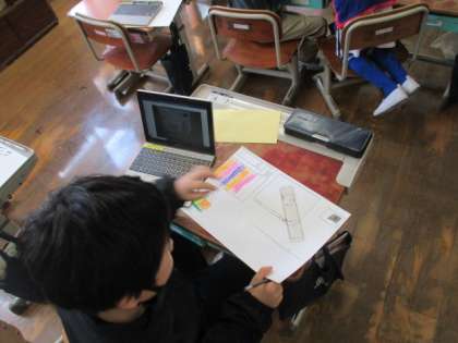 ポスターには部屋の絵もかいています。クレパスを使って、きれいに仕上げています。絵をかくときには、GIGA端末もうまく使いながら作業を進めていました。