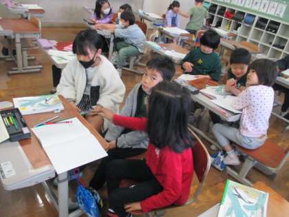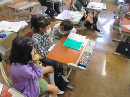 国語科「きょうのできごと」では、日記を書くことに取り組んでいます。最近起こった出来事を「いつ」「どこで」「だれが」「何をした」か分かるように日記に書きます。写真は、日記に書くことを集めるために、班で最近あった出来事を話し合っている様子です。 「したこと」だけではなく、「言ったこと」や「思ったこと」「その理由」まで書き込めると読んでいて楽しい日記になりますね。