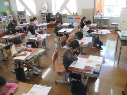 1時間目のにこにこ集会を受けて、2時間目、クラスではにこにこ道徳に取り組みました。きまりを守る意味についてみんなで考えました。一輪車を隠したことが先生にばれてしまった二人の主人公の気持ちを、みんな豊かに想像していました。