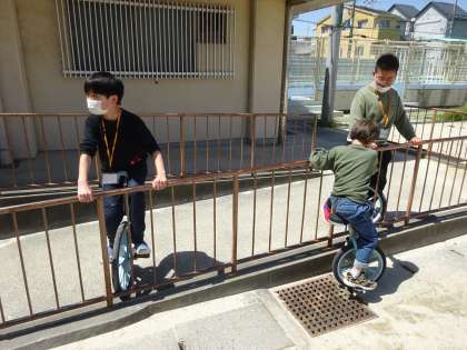 中間休みに、6年生と一緒に一輪車をして遊びました。