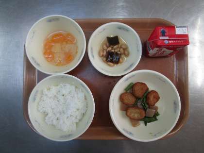 今日の給食は、ごはん 牛乳 平天の煮つけ こんぶ豆 フルーツ寒天です。