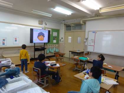1年生も一緒に、ビデオを見ながらうがいをしました。1年生は、水で練習です。
