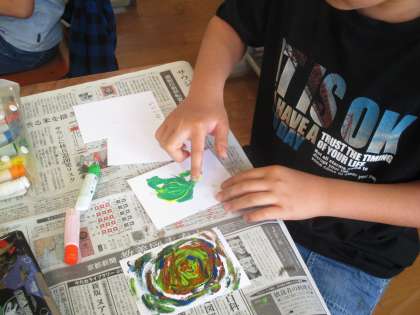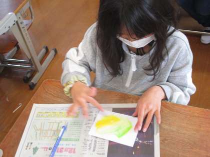 図工の学習で小さな紙の上で絵の具をゆっくりまぜてみました。