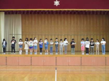 17日(水)の音読発表会の練習が始まっています。今日は、体育館で実際の動きも確かめながら練習を進めました。みんな、体育館の端から端まで聞こえる大きな声でやる気も十分です。みんなでそろえて言うところをもう少し揃えて、あとは本番に向けて繰り返し練習あるのみ!!