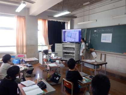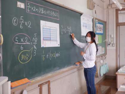 面積図を使って分数×整数の計算の仕方を考えました。面積図を使って分数を明らかにしました。分子と分子をかける計算では、6分の1が何個分というここと、約分をするということを話し合うことができました。