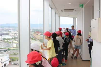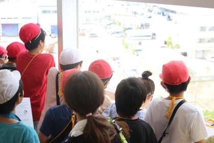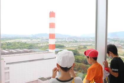 煙突があるということは予想していた子どもたちですが、何とそこに展望台がありました。周囲の施設について知ったり、昔の一体の様子について聞かせていただいたりして、幅広い学びをさせていただきました。建てられる場所にも意味があるのですね。