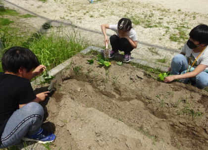 準備しておいた畝に、葉っぱが見えるように気をつけて、丁寧に植えていきます。