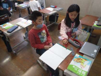 算数の時間では、十の位にもくり上がりのあるたし算のひっ算の学習をしました。全体で確認した後、まとめや練習問題に入る前にシェアの時間をとります。そこでは、1時間での学びをノートを使って、友だちと話し手、聞き手に分かれて伝え合います。ノートを指さしながら一生懸命伝えようとする子どもたちの様子はとても素晴らしいです!