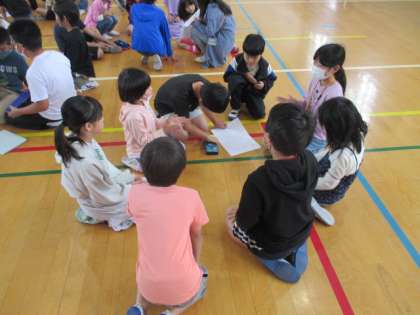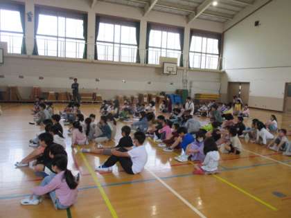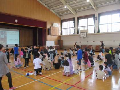 1時間目に全校で体育館に集まり、第1回の「ようせいタイム」がありました。今日は1回目ということもあり、顔合せと簡単な身体を使ったゲームに取り組みました。