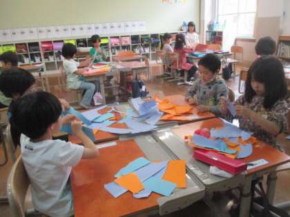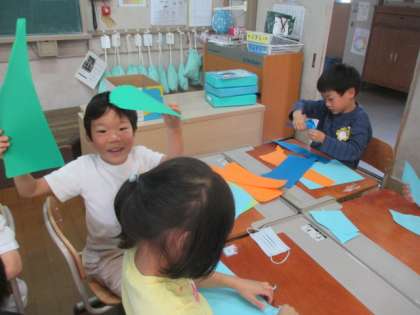 破いた画用紙を見立てて、絵にしていきます。今日は、画用紙を思い思いに破いてみました。破きながら、「あっ、これきりんの首みたい!」「これは恐竜かな?」「きばを描いたらわにになりそう!」などすでに見立てている子がたくさんいました。これから絵にしていきます。どんな絵になるのか楽しみです。