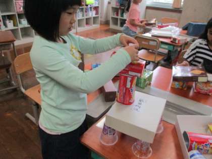 箱にはいろいろなかたちがあります。その形を使って、動物や車、タワーなど様々なものをつくりました。形を見て「これはタイヤにできそう!」「こっちのほうがバランスがいいんじゃない?」など友だちと協力し合って作ることができました。
