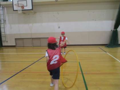 フラフープなどの用具を使い、どんなことができるのかを確かめました。今日はフラフープを転がして相手に渡していくゲームをしました。ほかにはどんなことができるでしょうか。これからの学習が楽しみですね。