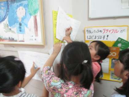 図書委員会の企画で、校内に本に関するクイズが貼りだされているので、1年生の子どもたちも早速挑戦しにいきました。ヒントになる本を読んで答えを出したりと楽しんでいました。