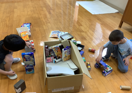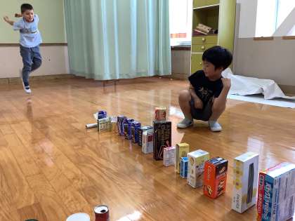 いろいろな かたちの はこを つかって、つんだり、ならべたりしました。
