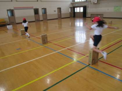 体育科「とびあそび」では、段ボールをとんで遊びました。低い段ボールや高い段ボールを飛び越しながら、高くとぶコツを探りました。「手をふると高くとべました。」「膝を曲げてためるといいと思いました。」と、高くとぶコツに気付いている人もたくさんいました。