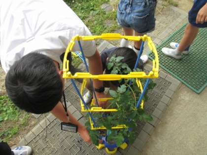 生活科「ぐんぐん育て おいしいやさい」の学習で育てているトマトの支柱を立てました。苗から育てているミニトマトは、ぐんぐん背をのばし立派に育ってきています。