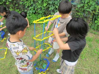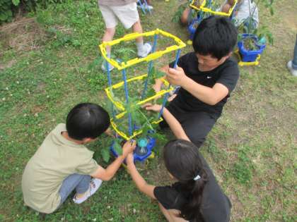 中には、その重さに耐えられなくなって少し茎が曲がり始めているものもありました。せっかく育てたミニトマトが折れてしまわないように支柱のなかに茎を入れ、真っ直ぐ育つように支えました。みんなで協力して支柱を立てている姿がよかったです。